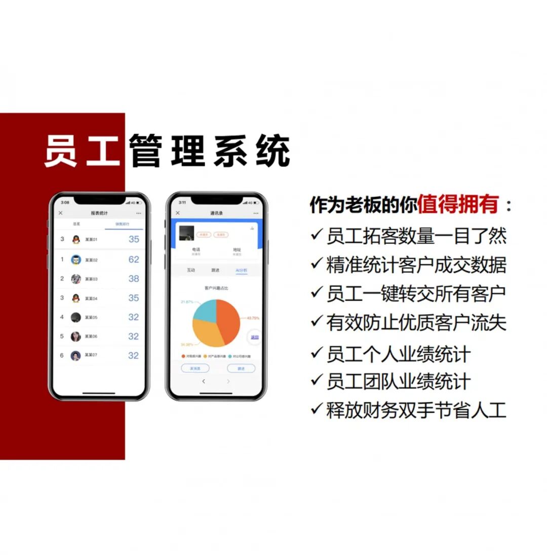 管理者在后台可查看员工的信息和业绩,并给员工添加标签,实现分类管理、一键发放绩效奖励等。让懂公司、懂产品的员工成为产品的服务的销售者。